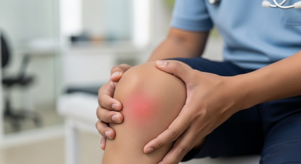 Kulit di kawasan lutut mungkin kelihatan merah dan terasa suam atau panas bila disentuh — terutama jika melibatkan jangkitan.