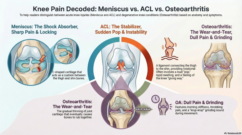 Kadang-kadang simptom sakit lutut boleh kelihatan hampir sama. Namun terdapat beberapa perbezaan penting yang boleh membantu membezakan antara masalah meniskus koyak, osteoarthritis (OA) dan kecederaan ligamen ACL.