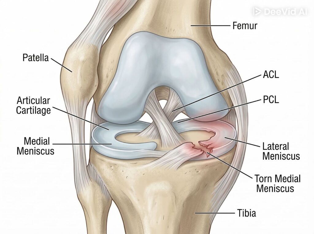 Di dalam lutut kita terdapat satu struktur penting yang dipanggil meniskus. Meniskus ialah rawan berbentuk C yang terletak di antara tulang paha (femur) dan tulang kering (tibia). Ia berfungsi seperti kusyen atau penyerap hentakan, membantu mengagihkan tekanan dan menstabilkan pergerakan lutut ketika berjalan, berlari atau melompat. Setiap lutut mempunyai dua meniskus iaitu meniskus medial (bahagian dalam) dan meniskus lateral (bahagian luar).