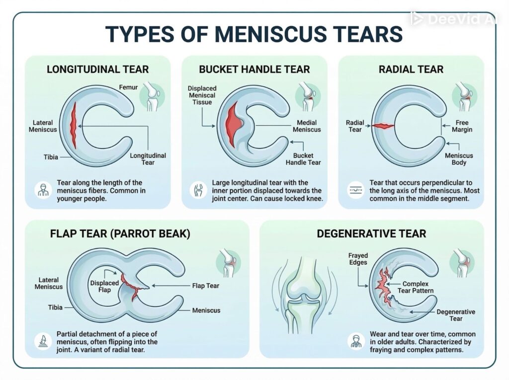 Antara jenis koyakan meniskus yang biasa ditemui ialah: